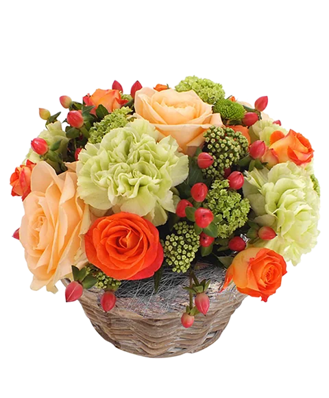 con fiorellini verdi, bacche e verde decorativo in cesto