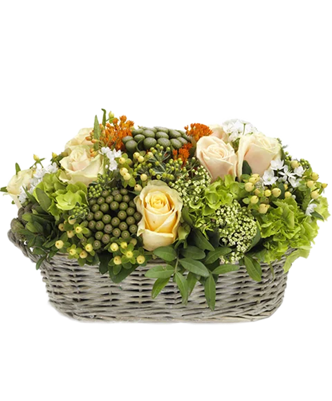 e rosa chiaro con bacche verdi e fiorellini arancio con verde decorativo in cestino